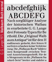 Zu Ehren kam Walbaums Antiqua allerdings erst, nachdem sie 1920 bei Brockhaus wiederentdeckt wurde. Kurz bevor die ästhetisch weit überlegene Walbaum fertiggestellt war, brachte die Jenaer Gießerei Frillwitz einen Didot-Verschnitt heraus, der den deutschen Markt eroberte.