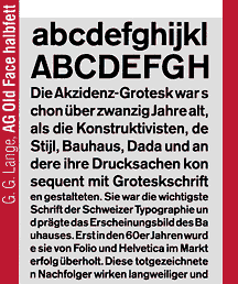 Ohne die ausgleichende Wirkung der Serifen war es schwer, ein ruhiges Schriftbild zu erzeugen. Erst gegen Ende des Jahrhunderts gelang es den Gießereien Berthold und Bauer, eine hervorragend lesbare Serifenlose Linear-Antiqua vorzustellen, die "Akzidenz-Grotesk".