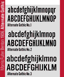 Im Bleisatz mehrere Textzeilen Blocksatz zu setzen, war eine zeitraubende Angelegenheit. Zwischen allen Worten oder gar Buchstaben einer Zeile mußten von Hand Leerräume eingefügt werden, bis die Zeilenenden links und rechts bündig abschlossen. Um diese Aufgabe zu erleichtern, entwarf Morris Fuller Benton drei Schriftschnitte mit gleicher Strichstärke, aber unterschiedlich breiten Proportionen. Der Typograph konnte nun mehr Worte in eine Zeile packen, wenn er den engen Schnitt "Alternate Gothic No.1" wählte, während ihm die breite Variante "No.3" beim Auffüllen von zu kurzen Zeilen half. Die eigentliche Innovation bestand jedoch darin, daß hier erstmals eine systematisch geplante, sorgfältig abgestimmte serifenlose Schriftfamilie geschaffen wurde.